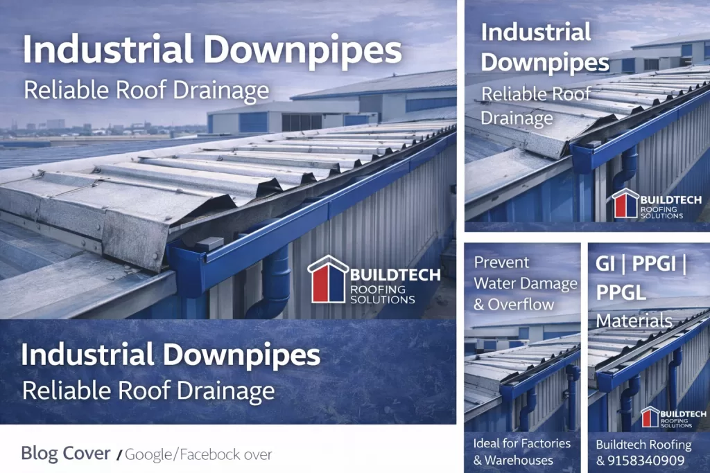 Industrial Downpipes – Safe & Efficient Rainwater Disposal for Industrial Buildings Industrial roofs handle large volumes of rainwater, especially during heavy monsoons. Without proper drainage, water overflow can damage walls, foundations, and roofing systems. Industrial downpipes play a critical role in safely carrying rainwater from gutters to ground-level drainage systems. At Buildtech Roofing Solutions, we manufacture and install heavy-duty industrial downpipes designed for high flow capacity, corrosion resistance, and long-term reliability. What Are Industrial Downpipes? Industrial downpipes are vertical drainage pipes connected to roof gutters. Their function is to transport rainwater safely from the roof to stormwater drains or collection pits, preventing overflow and structural damage. How Industrial Downpipes Work Because of this controlled flow, buildings remain safe during heavy rainfall. Types of Industrial Downpipes 1. Rectangular Downpipes 2. Round Downpipes 3. Custom-Fabricated Downpipes Materials Used Buildtech industrial downpipes are manufactured using: These materials ensure durability, corrosion resistance, and long service life. Key Advantages of Industrial Downpipes ✔ High rainwater discharge capacity✔ Prevents wall seepage and foundation damage✔ Corrosion-resistant coatings✔ Low maintenance requirements✔ Custom sizing for industrial roofs Applications Typical Technical Specifications Parameter Specification Material GI / PPGI / PPGL Thickness 0.45 – 0.80 mm Shape Rectangular / Round Length As per site requirement Finish Galvanized / Colour-coated Installation Wall-mounted with clamps Downpipes vs Improper Drainage Feature Industrial Downpipes No Proper System Water Control Excellent Poor Wall Protection High Low Maintenance Cost Low High Structural Safety Protected At risk Roof Life Extended Reduced Installation Best Practices Buildtech ensures leak-free and aligned installation for maximum drainage efficiency. Why Choose Buildtech Roofing Solutions Conclusion Industrial downpipes are essential for protecting roofs, walls, and foundations from rainwater damage. With Buildtech Roofing Solutions, clients receive robust materials, expert installation, and dependable drainage systems built for Indian industrial conditions.
