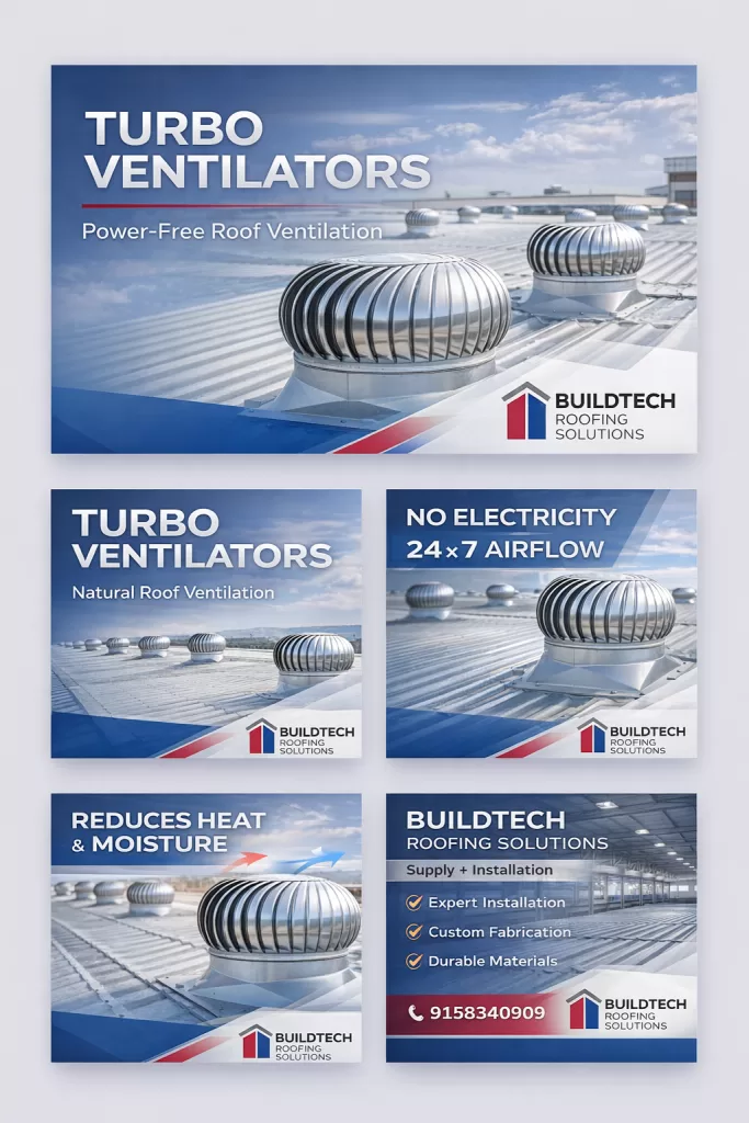 Turbo Ventilators – Power-Free Roof Ventilation for Industrial Buildings Industrial buildings generate substantial heat, fumes, and moisture due to continuous machinery operation and high occupancy levels. Without proper ventilation, these conditions can affect worker comfort, equipment efficiency, and overall productivity. Turbo ventilators offer a reliable, energy-efficient solution by continuously expelling hot air without electricity. At Buildtech Roofing Solutions, we supply and install high-quality turbo ventilators designed for smooth rotation, long service life, and consistent performance across demanding industrial environments. What Are Turbo Ventilators? A turbo ventilator is a wind-driven roof ventilation system installed at high points of an industrial roof. It works on natural principles of airflow—hot air rises and escapes through the rotating turbine, while fresh air enters from side openings, louvers, or ridge vents. Because turbo ventilators rely on wind movement and thermal pressure, they function continuously without motors, wiring, or power consumption. How Turbo Ventilators Work The operation of a turbo ventilator is simple yet highly effective: This ensures uninterrupted airflow even during power outages. Key Advantages of Turbo Ventilators ✔Zero Energy ConsumptionOperates entirely without electricity, reducing operational costs. ✔Continuous VentilationProvides airflow throughout the day and night. ✔Effective Heat & Moisture ReductionHelps lower indoor temperatures and humidity levels. ✔Silent OperationNo noise or vibration during functioning. ✔Low Maintenance RequirementFew moving parts ensure long-term reliability. ✔Weather-Resistant DesignProper flashing prevents rainwater ingress. Applications of Turbo Ventilators Turbo ventilators are widely used in: Typical Technical Specifications Parameter Specification Material Aluminium / Stainless Steel / PPGI base Throat Size 18”, 21”, 24” (custom sizes available) Operation Wind-driven & thermal pressure Power Requirement Nil Mounting Roof-mounted with flashing Specifications may vary depending on roof design and airflow requirements. Turbo Ventilators vs Exhaust Fans Feature Turbo Ventilator Exhaust Fan Power Consumption None Required Operating Cost Zero Continuous Coverage Area Large roof span Limited Maintenance Very low Regular Noise Level Silent Audible For large industrial buildings, turbo ventilators provide a more economical and sustainable solution. Installation Best Practices Buildtech’s trained installation teams ensure leak-free, stable, and long-lasting installations. Why Choose Buildtech Roofing Solutions? As a result, clients rely on Buildtech for dependable industrial ventilation systems. Conclusion Turbo ventilators are a cost-effective and eco-friendly solution for maintaining comfortable indoor conditions in industrial buildings. By eliminating heat buildup and improving air circulation without electricity, they enhance productivity and protect equipment. With Buildtech Roofing Solutions, you receive professionally engineered turbo ventilators and expert installation that deliver consistent performance for years to come.