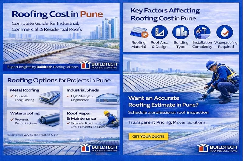 Introduction: Why Industrial Shed Roofing Design Matters in Pune Industrial sheds are the backbone of Pune’s manufacturing, logistics, and warehousing ecosystem. From MIDC zones to large logistics parks, the performance of an industrial shed depends heavily on roofing design. A poorly designed roof leads to heat buildup, leakage, corrosion, higher energy bills, and operational downtime. This guide explains industrial shed roofing design in Pune—covering design principles, material selection, ventilation, daylighting, waterproofing, costs, and common mistakes. The objective is to help decision-makers plan sheds that are durable, efficient, and future-ready. Understanding Pune’s Industrial Roofing Requirements Climate Considerations Operational Needs Core Principles of Industrial Shed Roofing Design 1) Structural Load & Span Design 2) Roof Slope & Drainage 3) Thermal & Energy Performance Types of Industrial Shed Roofing Systems Metal Roofing Systems (Most Preferred) Why preferred: PEB (Pre-Engineered Building) Shed Roofing Ideal for warehouses, logistics hubs, and manufacturing plants. Insulated Industrial Roofing Industrial Shed Ventilation & Daylighting Design Ventilation Systems Proper ventilation is essential for productivity and safety. These systems expel hot air and fumes, maintaining airflow without energy costs. Daylighting with Skylights Design must balance light intake with heat control. Waterproofing in Industrial Shed Roofing Design Waterproofing is not an add-on—it’s integral to design. Critical Waterproofing Zones Recommended Solutions Step-by-Step Industrial Shed Roofing Design Process Step1: Site & Requirement Analysis Step2: Engineering & Design Step3: Material Selection Step4: Installation Planning Step5: Inspection & Handover Industrial Shed Roofing Cost Factors in Pune Costs vary based on: Design-led costing avoids overspending and reduces long-term maintenance. Common Industrial Shed Roofing Design Mistakes Avoiding these errors significantly improves roof lifespan. Maintenance Considerations in Design Stage Good design simplifies maintenance. Why Choose Buildtech Roofing Solutions for Industrial Shed Roofing in Pune Buildtech designs industrial shed roofs that support operations—not disrupt them. FAQs: Industrial Shed Roofing Design in Pune What is the best roofing material for industrial sheds?Color-coated or galvanized metal roofing is due to its strength and durability. Is ventilation necessary in industrial sheds?Yes. It improves air quality, temperature control, and worker comfort. How long does an industrial shed roof last?With proper design and maintenance, 20–30 years. Can existing sheds be upgraded?Yes. Ventilation, waterproofing, and sheet upgrades are possible. Conclusion: Design Smart, Build Durable A well-designed industrial shed roof is a strategic investment. It improves productivity, reduces energy costs, and minimizes long-term maintenance. By focusing on engineering fundamentals, climate suitability, and quality materials, industrial shed roofing design in Pune can deliver decades of reliable performance. For engineered, cost-effective, and future-ready industrial shed roofing, Buildtech Roofing Solutions is your trusted partner across Pune and Maharashtra.