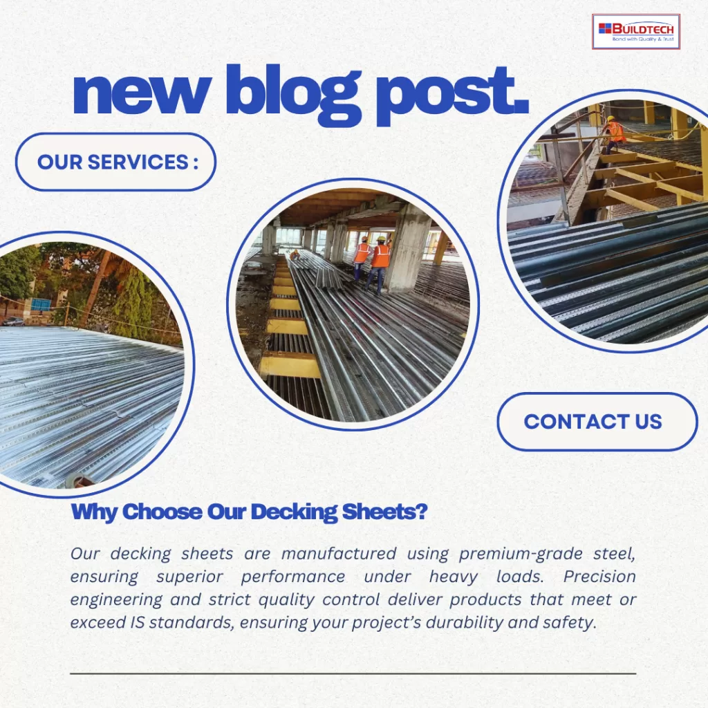 Metal Deck Sheets – Strong, Efficient & Modern Construction Solutions Modern industrial and commercial construction demands faster execution, higher load capacity, and long-term structural reliability. Metal deck sheets meet these requirements by acting as permanent formwork and reinforcement for concrete slabs, thereby improving efficiency and structural performance. At Buildtech Roofing Solutions, we supply and install high-strength metal deck sheets that accelerate construction timelines, reduce overall costs, and deliver dependable performance for industrial projects across India. What Are Metal Deck Sheets? Metal deck sheets are profiled steel sheets used as a base for reinforced concrete slabs or roofing systems. Once concrete is poured, the deck sheet works compositely with concrete, enhancing strength, stiffness, and stability. As a result, the system eliminates the need for conventional shuttering. Types of Metal Deck Sheets 1. Floor Deck Sheets Floor deck sheets are commonly used for RCC slab construction in multi-storey buildings, warehouses, mezzanine floors, and industrial facilities. 2. Roof Deck Sheets Roof deck sheets function as structural roofing systems and can be combined with insulation and waterproofing layers for improved thermal and weather performance. Key Advantages of Metal Deck Sheets ✔ Faster Construction Metal deck sheets remove the need for traditional shuttering, which significantly speeds up slab casting and project completion. ✔ High Load-Bearing Capacity Due to composite action with concrete, metal deck systems deliver superior structural strength. ✔ Cost Savings Reduced shuttering materials, lower labour requirements, and faster timelines help minimise overall construction costs. ✔ Lightweight Structure Metal deck slabs impose a lower dead load compared to conventional RCC slabs. ✔ Durable & Corrosion-Resistant Manufactured using galvanized or colour-coated steel, metal deck sheets offer long-term durability in industrial environments. Applications of Metal Deck Sheets Metal deck sheets are widely used in: Technical Specifications (Typical) Parameter Specification Material GI / PPGI Thickness 0.8 – 1.2 mm Profile Height 50 – 75 mm Span Capability As per the design load Coating Galvanized / Colour-coated Installation Fixed to a steel structure Metal Deck Sheets vs Conventional Slabs Feature Metal Deck Sheets Conventional Slabs Construction Speed Very fast Slow Shuttering Minimal Heavy Load Performance High Moderate Labour Cost Lower Higher Structural Efficiency Excellent Standard Installation Best Practices Buildtech’s experienced installation teams ensure precision, safety, and compliance at every stage. Why Choose Buildtech Roofing Solutions? Conclusion Metal deck sheets are a core solution for modern industrial construction, offering unmatched speed, strength, and cost efficiency. With Buildtech Roofing Solutions, clients receive premium-quality materials and expert execution that meet demanding structural and project requirements.