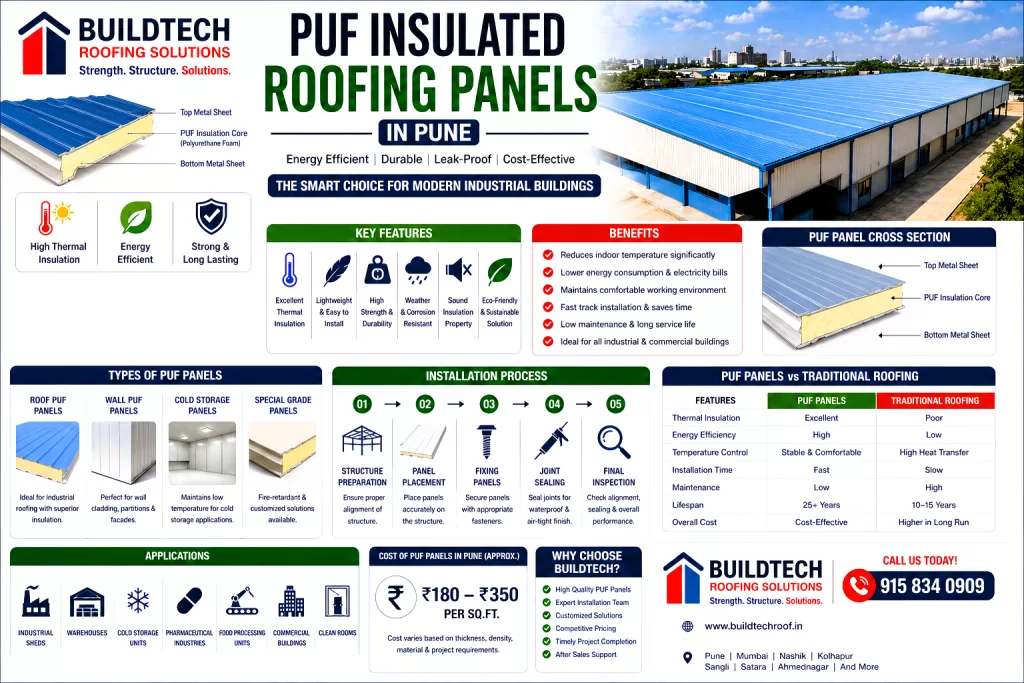 With PUF Insulated Roofing Panels Pune solutions by Buildtech Roofing Solutions, businesses can achieve better temperature control, lower energy costs, and improved operational efficiency.